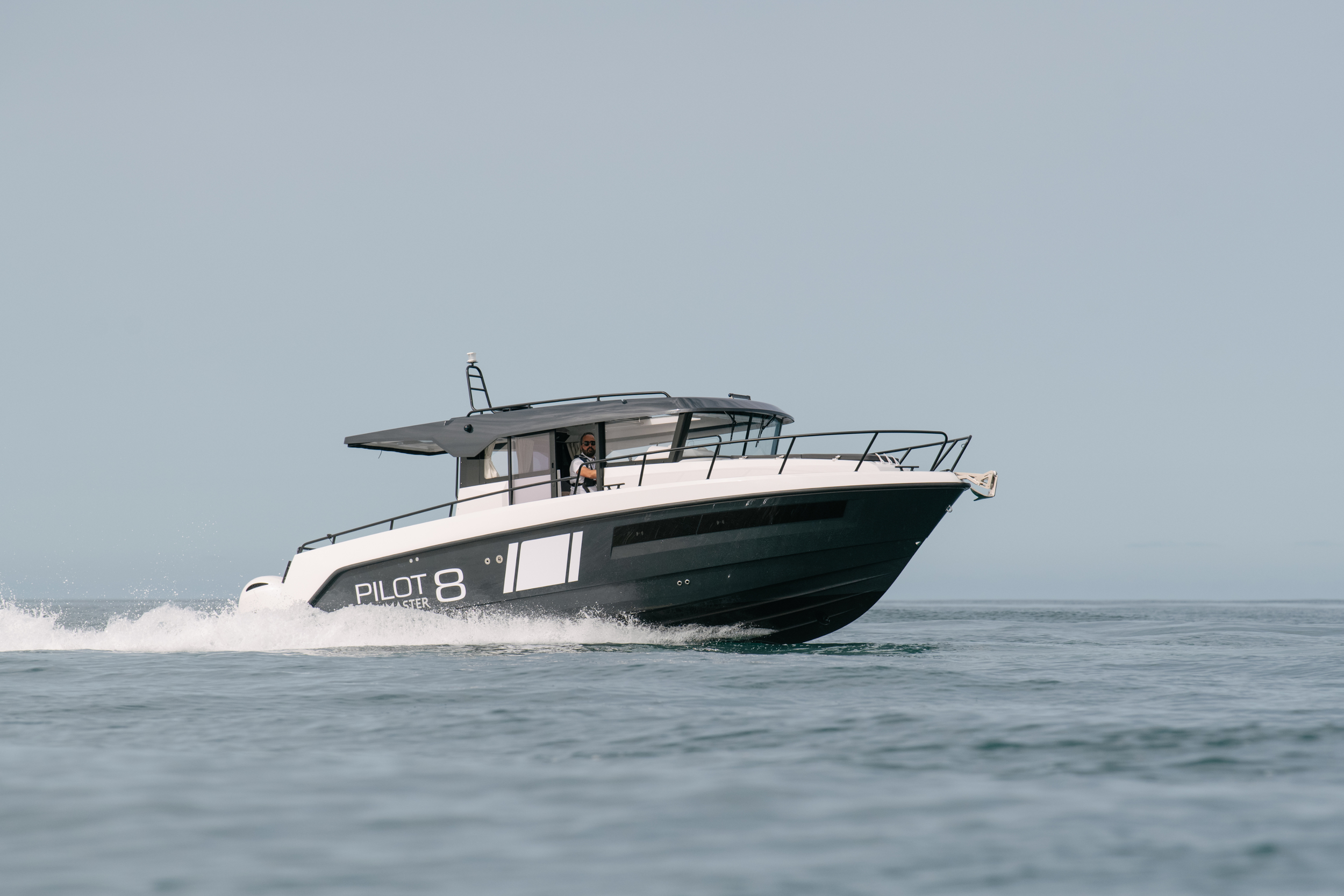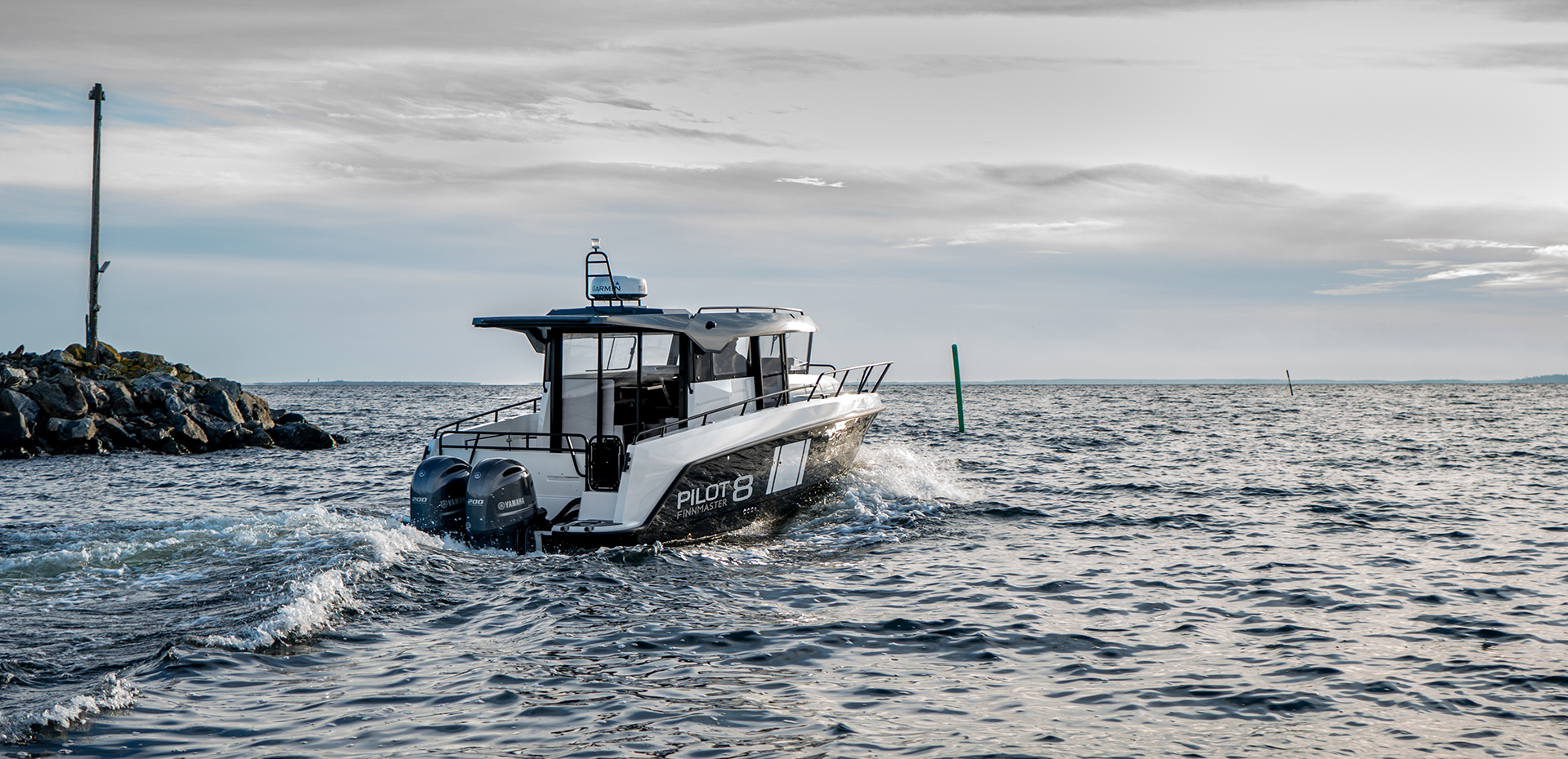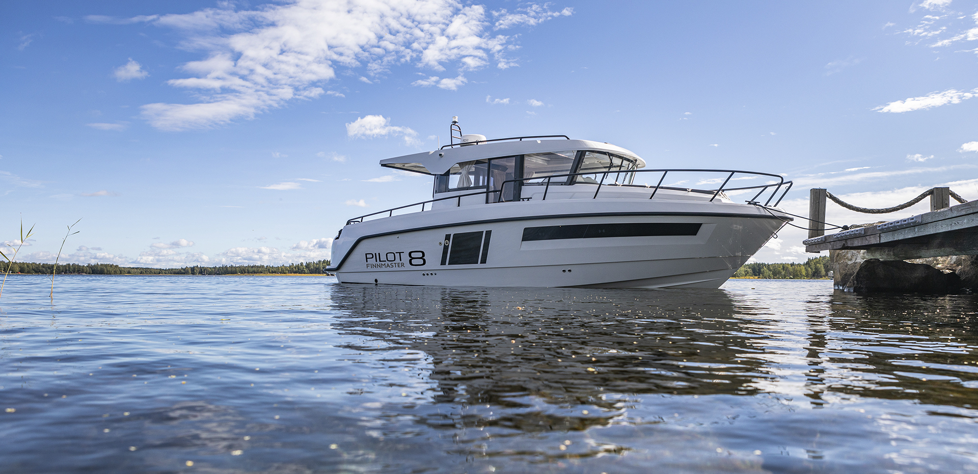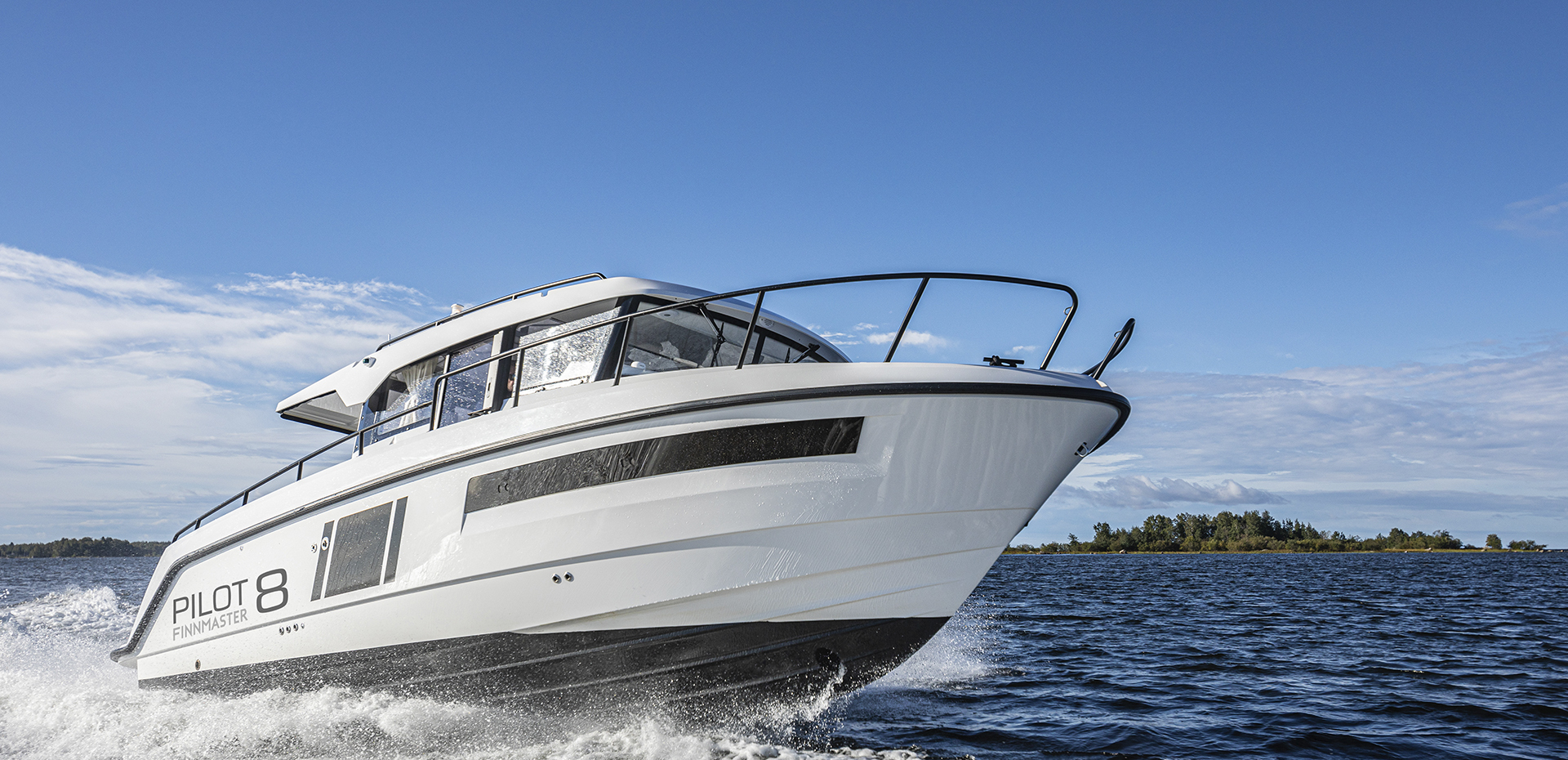 The Finnmaster Pilot 8 is our largest cabin boat – a real multi-purpose boat. Whether you’re looking for a SUV boat, fishing boat or weekend boat where the whole family can stay overnight – this is just the right motorboat for you. The boat’s redesigned extended roof provides protection from rain and sunshine for those staying in the aft deck. The spacious wheelhouse has a large full-width sunroof and a four-person dinette, and a well-equipped galley for travel comfort. At the forward cabin, you will find plenty of storage space as well as a large, separate toilet and sleeping berths for four adults. The boat has versatile and comprehensive standard equipment, which includes, e.g., Yamaha fully electric steering and optional Yamaha autopilot and joystick control. Finnish quality for a competitive price. Can be delivered ready to go with trailer and Yamaha outboard motor (advice 250-400 hp).