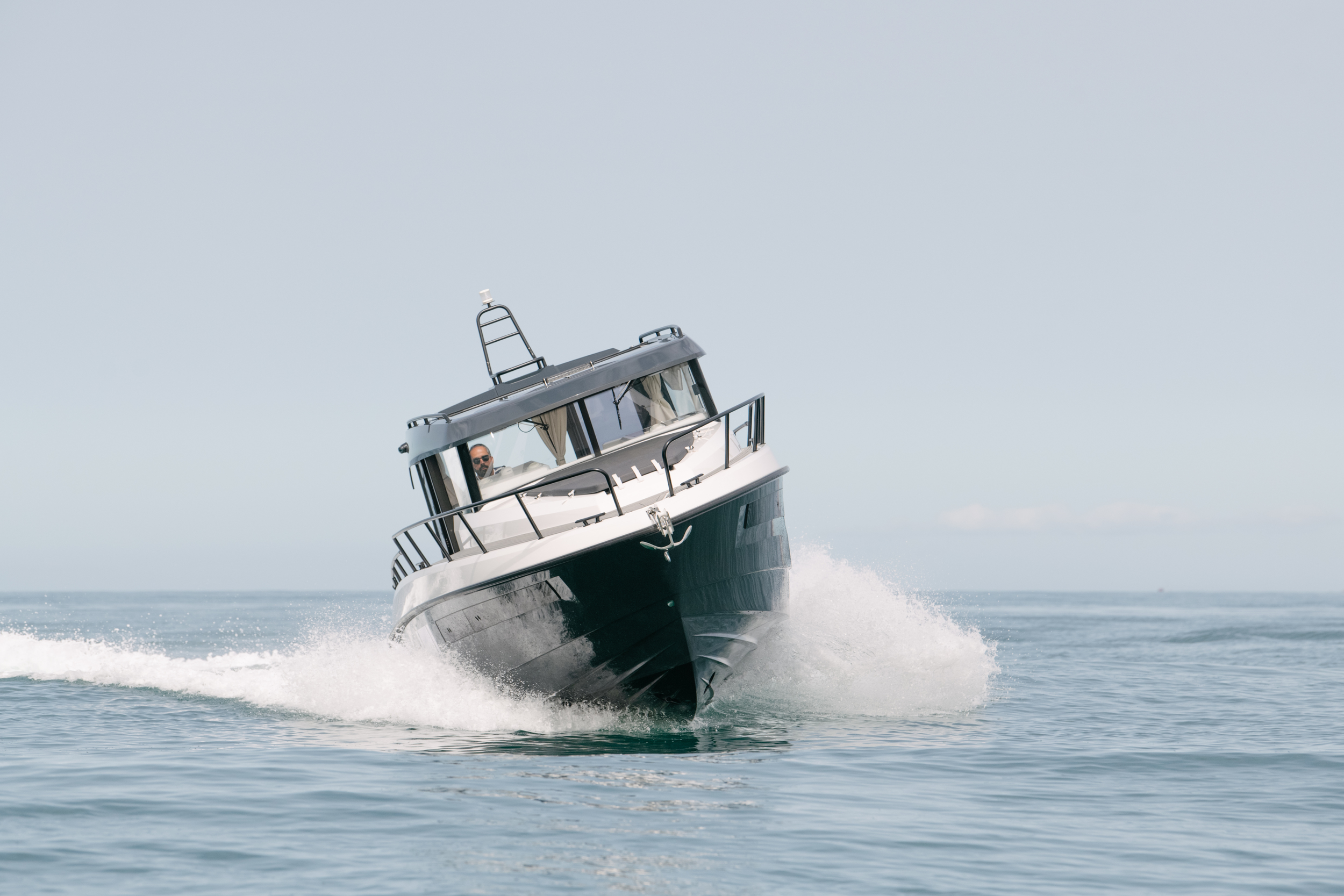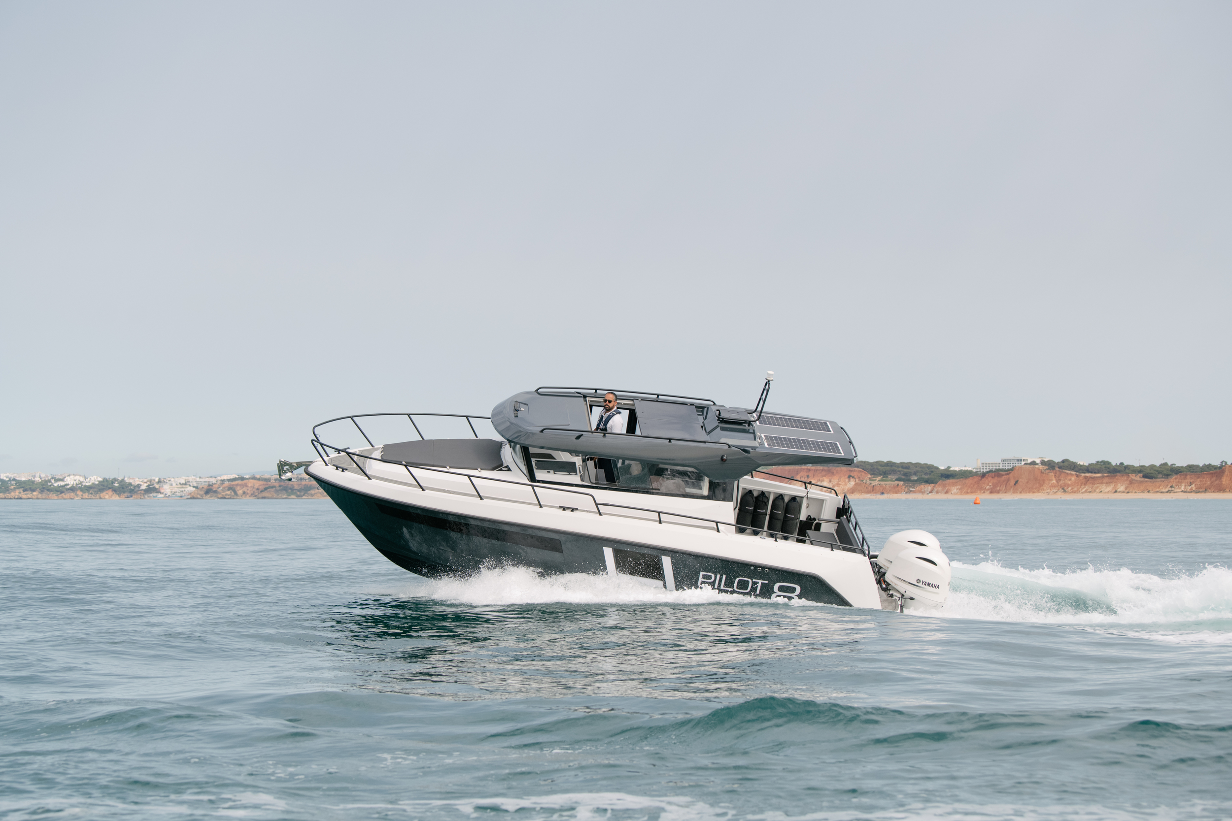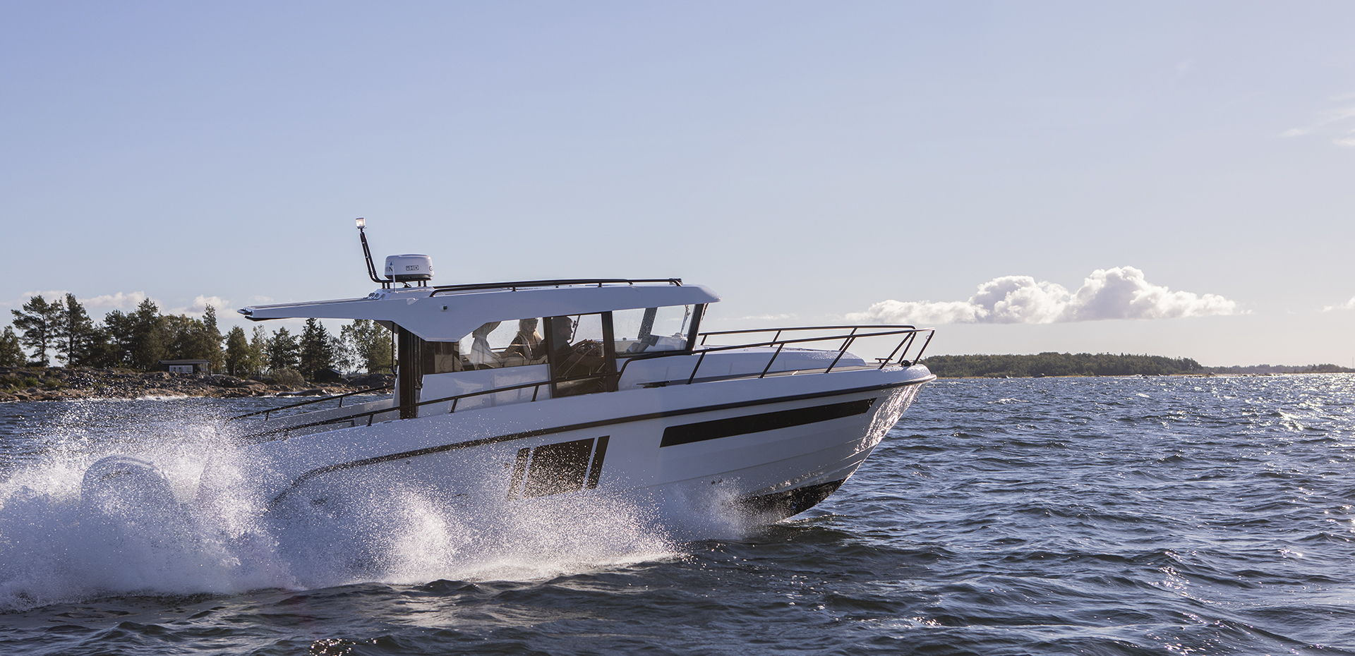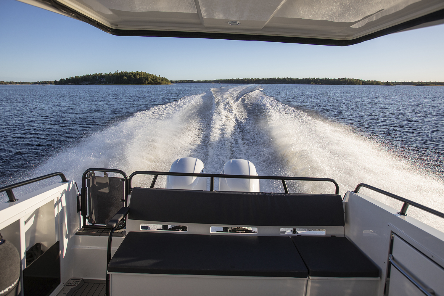 The Finnmaster Pilot 8 is our largest cabin boat – a real multi-purpose boat. Whether you’re looking for a SUV boat, fishing boat or weekend boat where the whole family can stay overnight – this is just the right motorboat for you. The boat’s redesigned extended roof provides protection from rain and sunshine for those staying in the aft deck. The spacious wheelhouse has a large full-width sunroof and a four-person dinette, and a well-equipped galley for travel comfort. At the forward cabin, you will find plenty of storage space as well as a large, separate toilet and sleeping berths for four adults. The boat has versatile and comprehensive standard equipment, which includes, e.g., Yamaha fully electric steering and optional Yamaha autopilot and joystick control. Finnish quality for a competitive price. Can be delivered ready to go with trailer and Yamaha outboard motor (advice 250-400 hp).