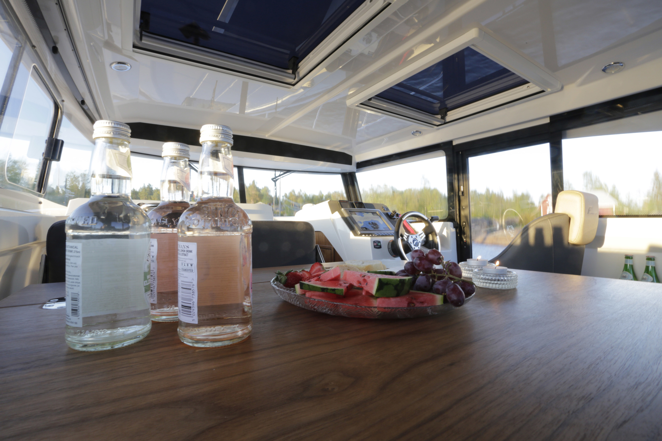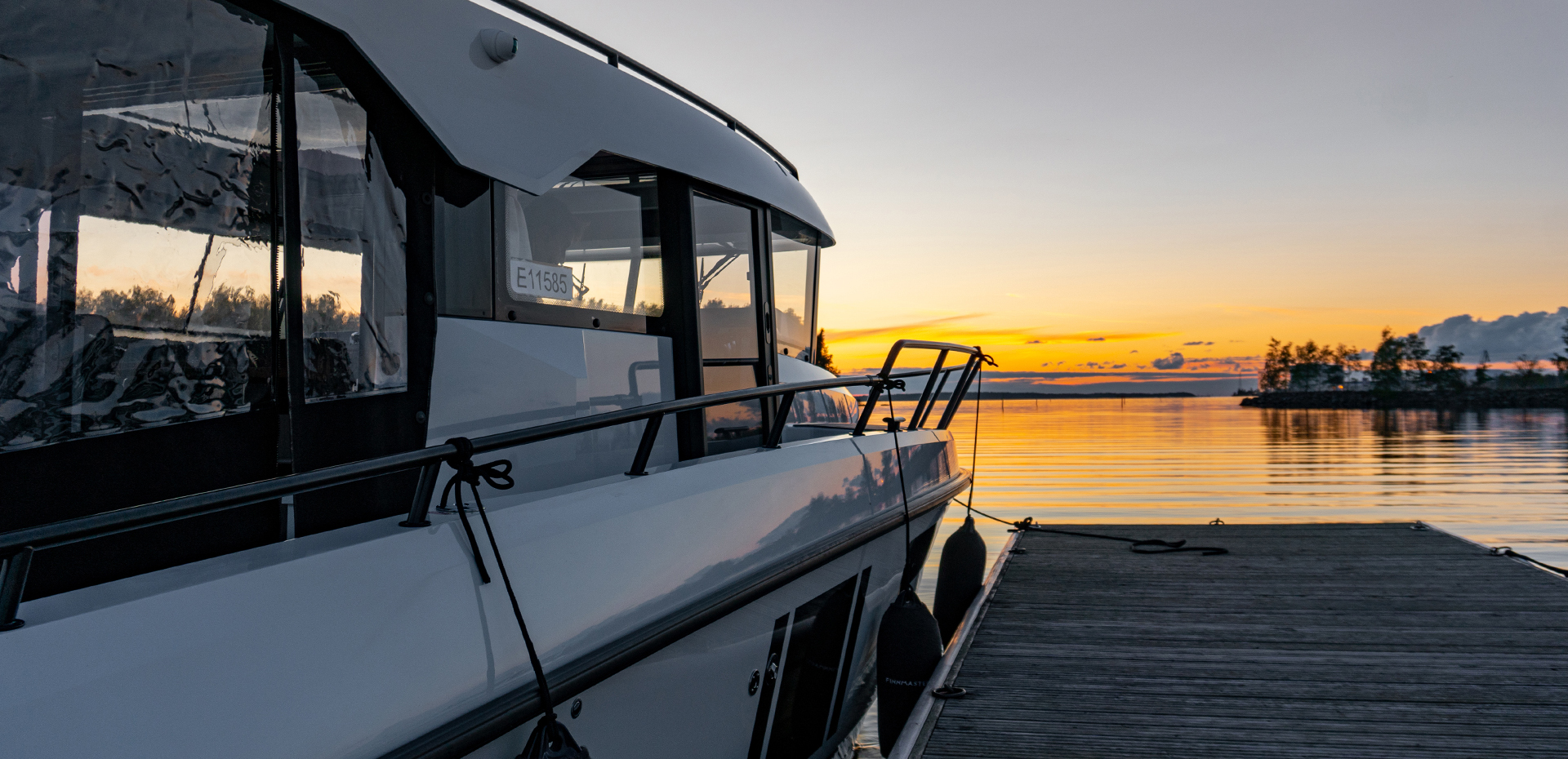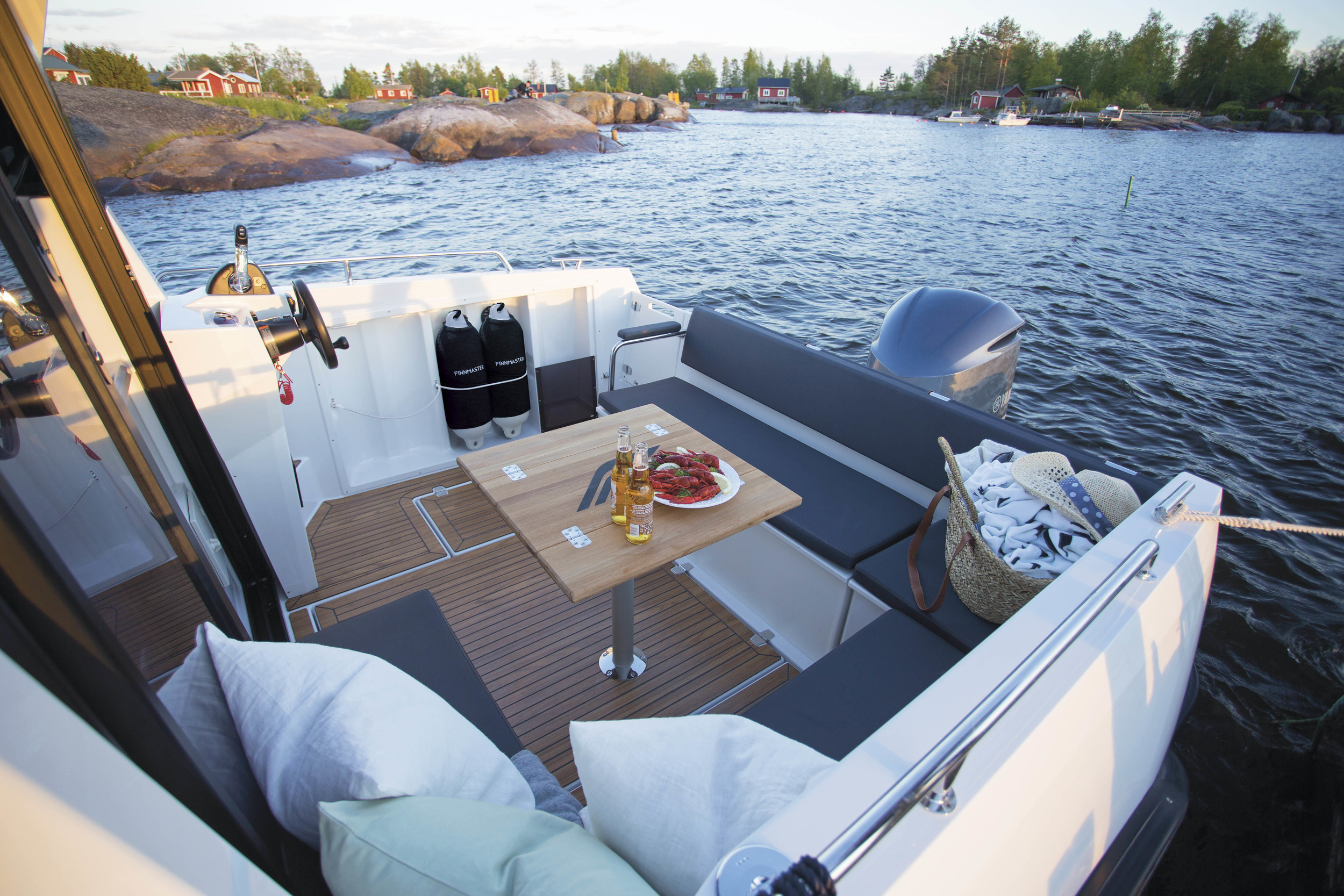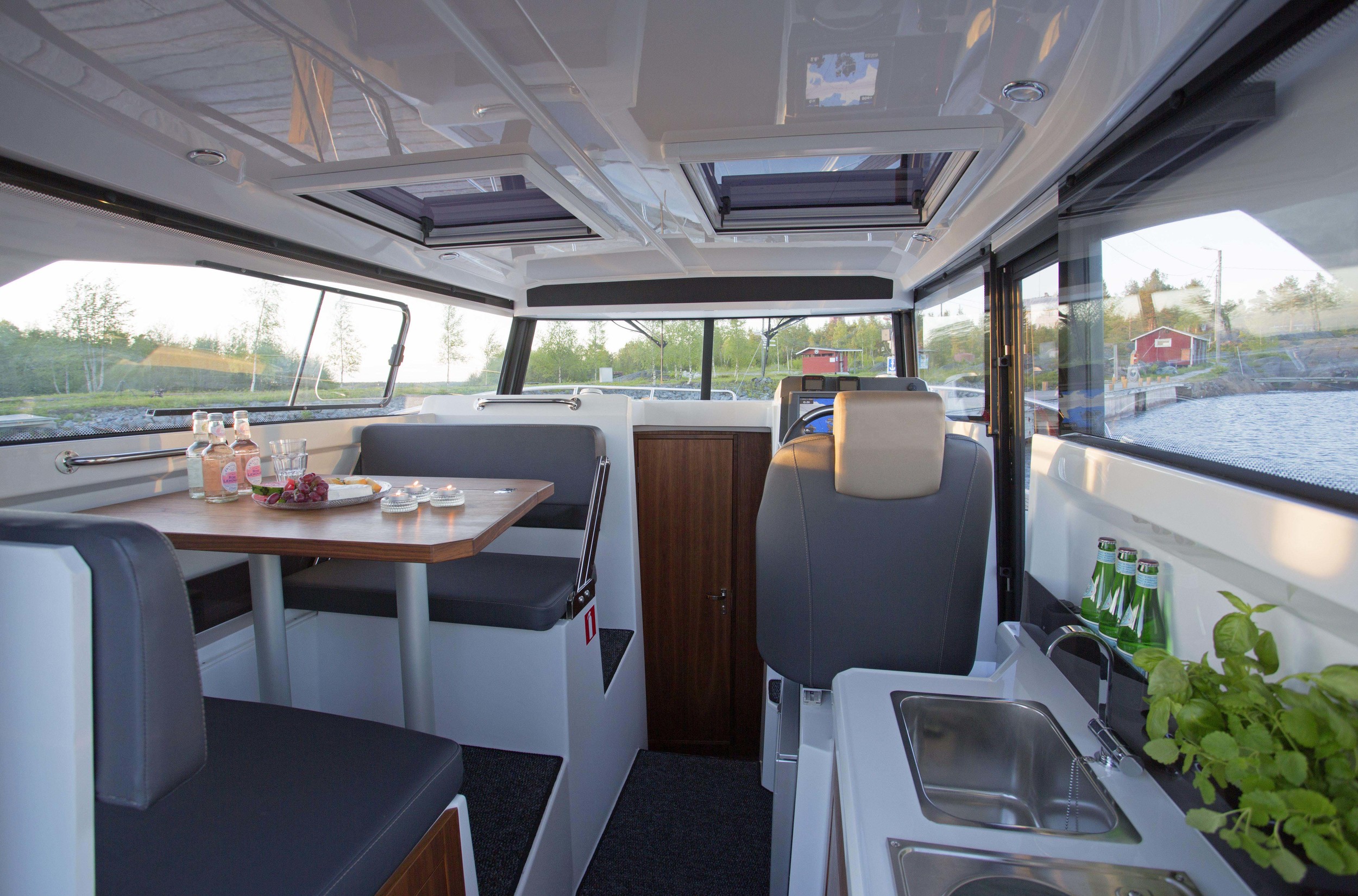 The Finnmaster Pilot 8 is our largest cabin boat – a real multi-purpose boat. Whether you’re looking for a SUV boat, fishing boat or weekend boat where the whole family can stay overnight – this is just the right motorboat for you. The boat’s redesigned extended roof provides protection from rain and sunshine for those staying in the aft deck. The spacious wheelhouse has a large full-width sunroof and a four-person dinette, and a well-equipped galley for travel comfort. At the forward cabin, you will find plenty of storage space as well as a large, separate toilet and sleeping berths for four adults. The boat has versatile and comprehensive standard equipment, which includes, e.g., Yamaha fully electric steering and optional Yamaha autopilot and joystick control. Finnish quality for a competitive price. Can be delivered ready to go with trailer and Yamaha outboard motor (advice 250-400 hp).
