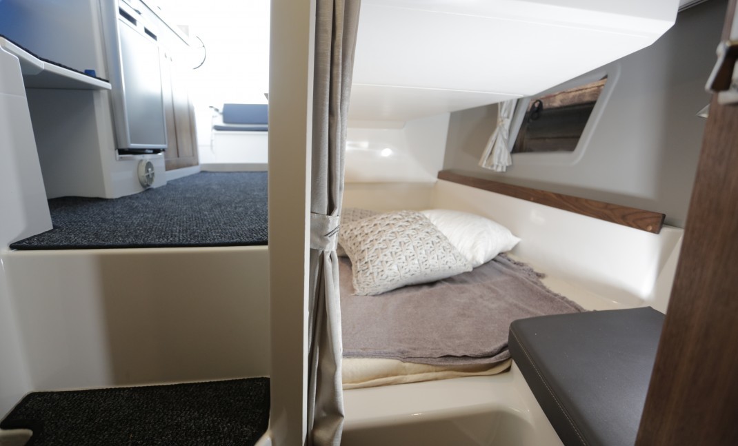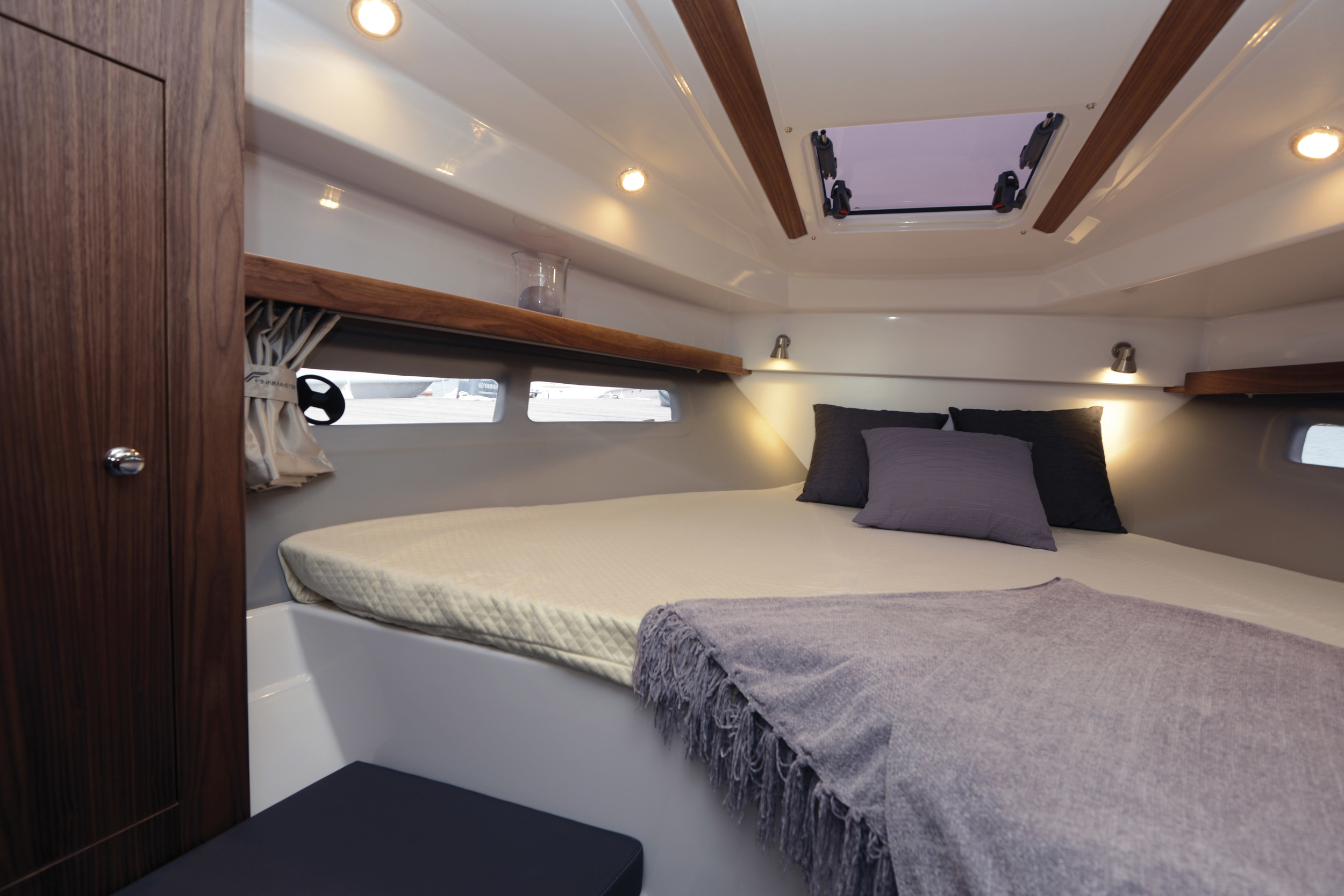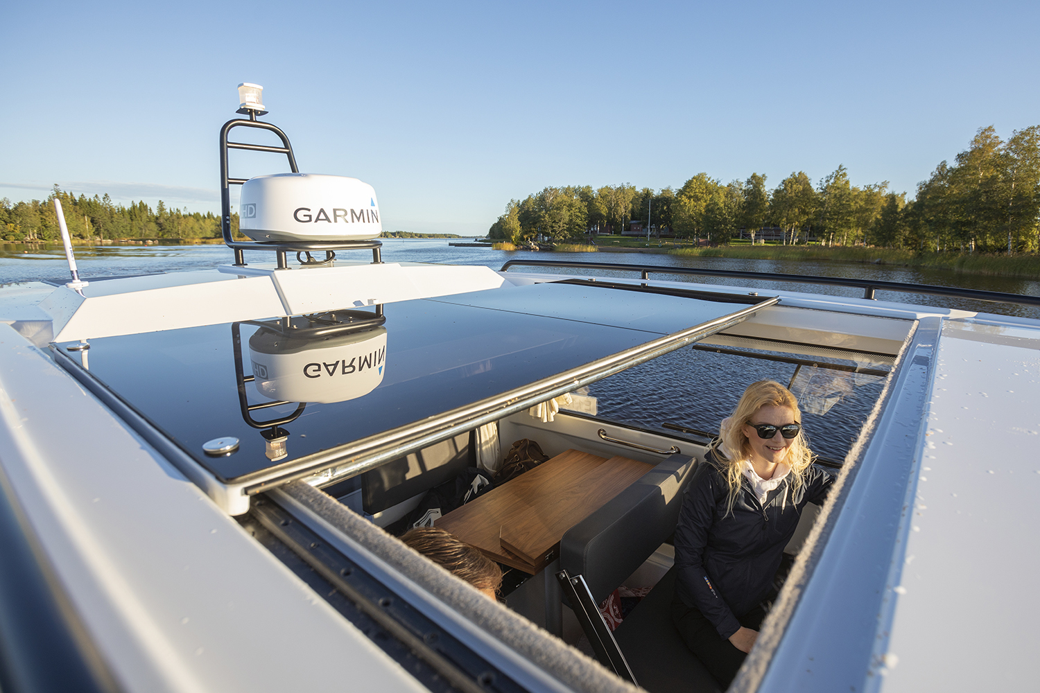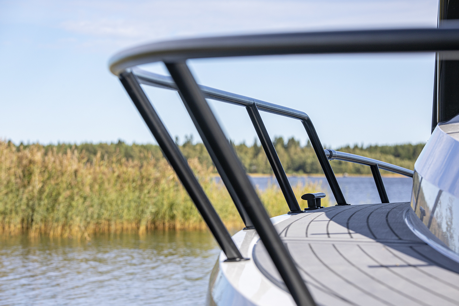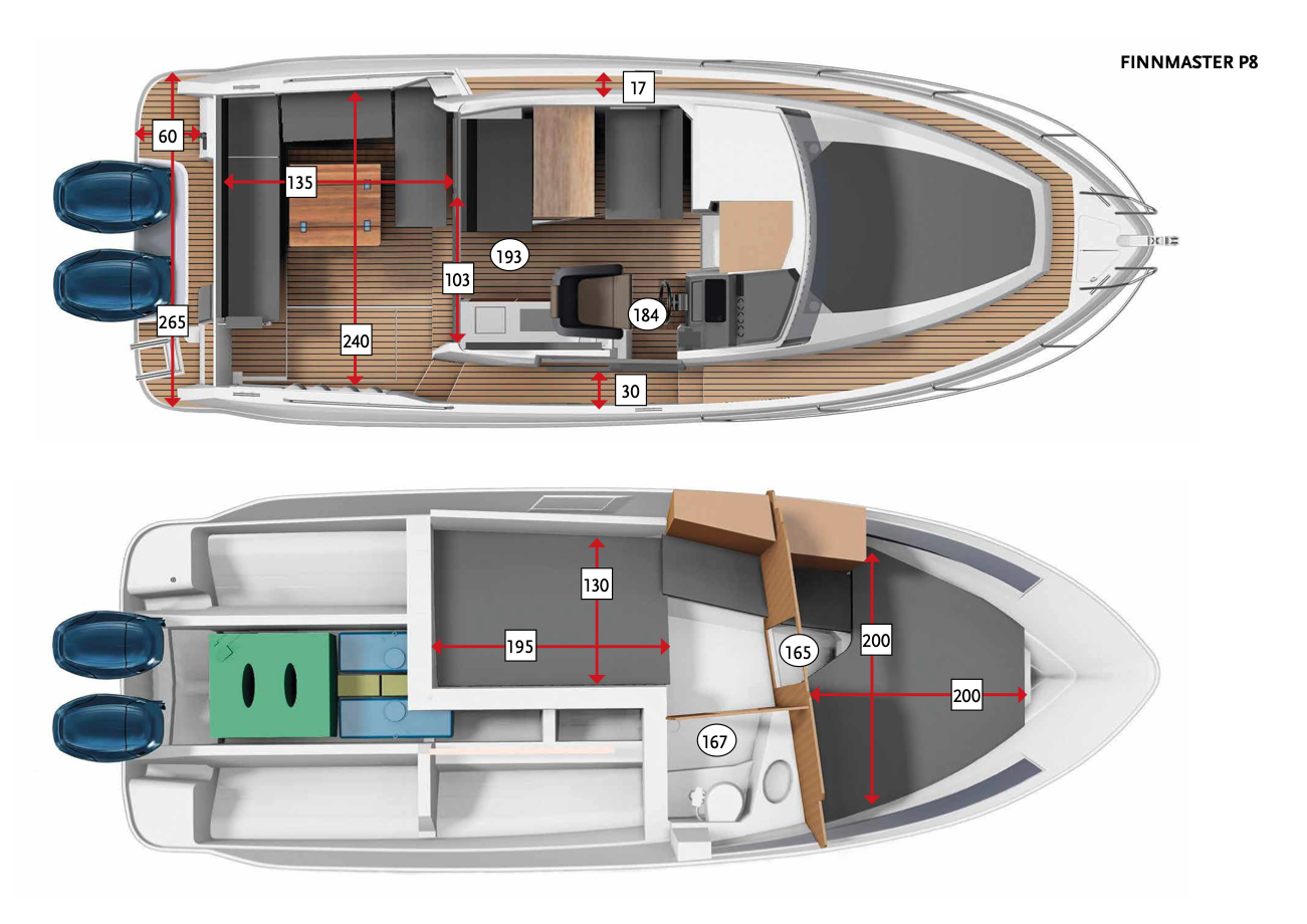 The Finnmaster Pilot 8 is our largest cabin boat – a real multi-purpose boat. Whether you’re looking for a SUV boat, fishing boat or weekend boat where the whole family can stay overnight – this is just the right motorboat for you. The boat’s redesigned extended roof provides protection from rain and sunshine for those staying in the aft deck. The spacious wheelhouse has a large full-width sunroof and a four-person dinette, and a well-equipped galley for travel comfort. At the forward cabin, you will find plenty of storage space as well as a large, separate toilet and sleeping berths for four adults. The boat has versatile and comprehensive standard equipment, which includes, e.g., Yamaha fully electric steering and optional Yamaha autopilot and joystick control. Finnish quality for a competitive price. Can be delivered ready to go with trailer and Yamaha outboard motor (advice 250-400 hp).