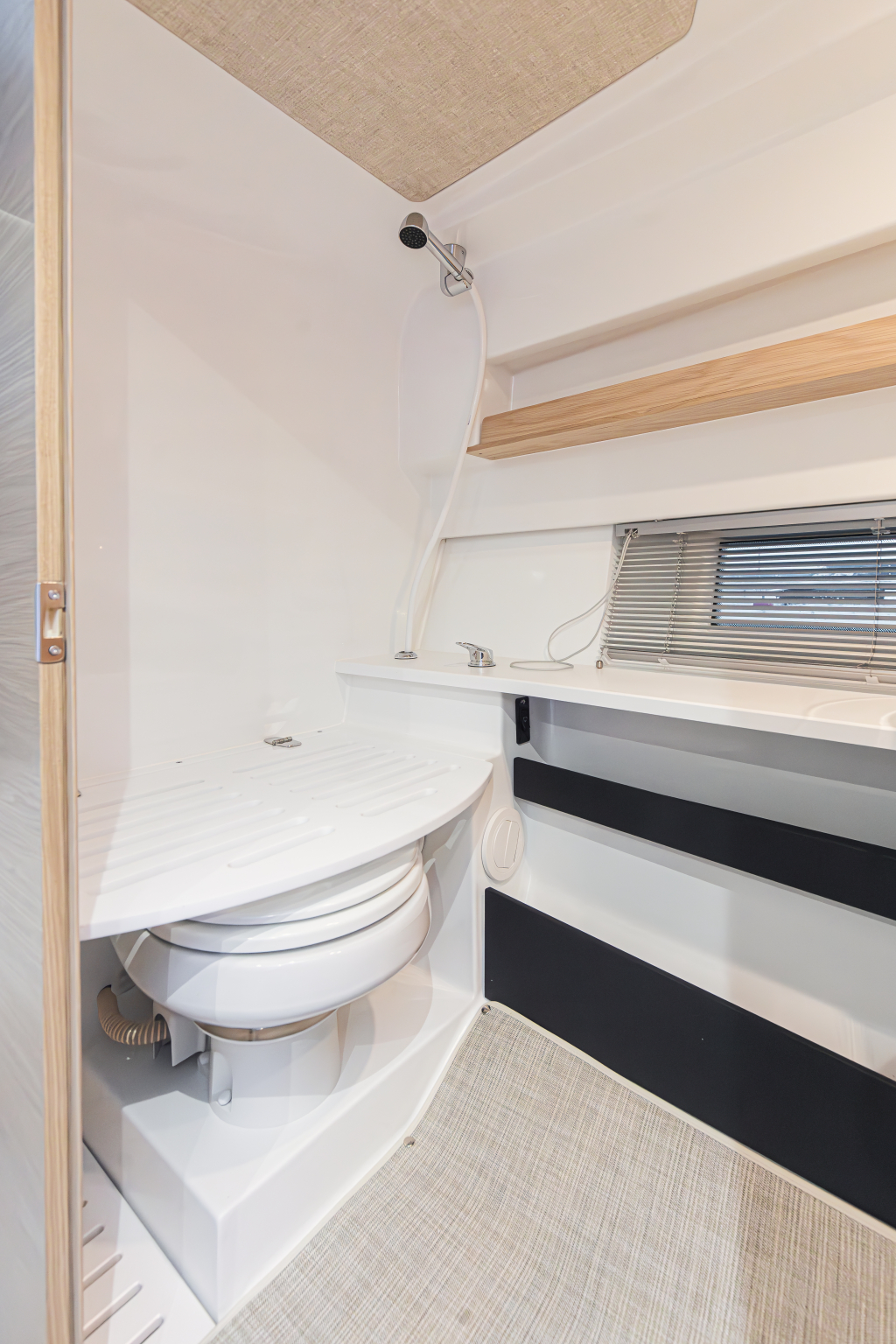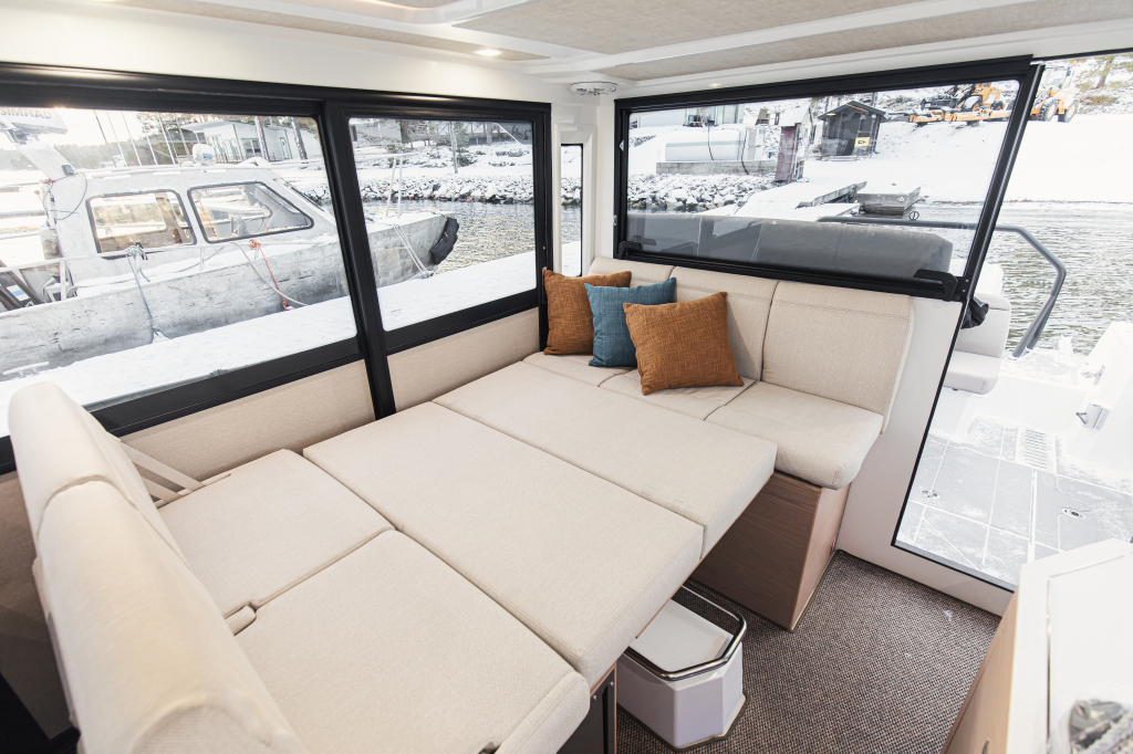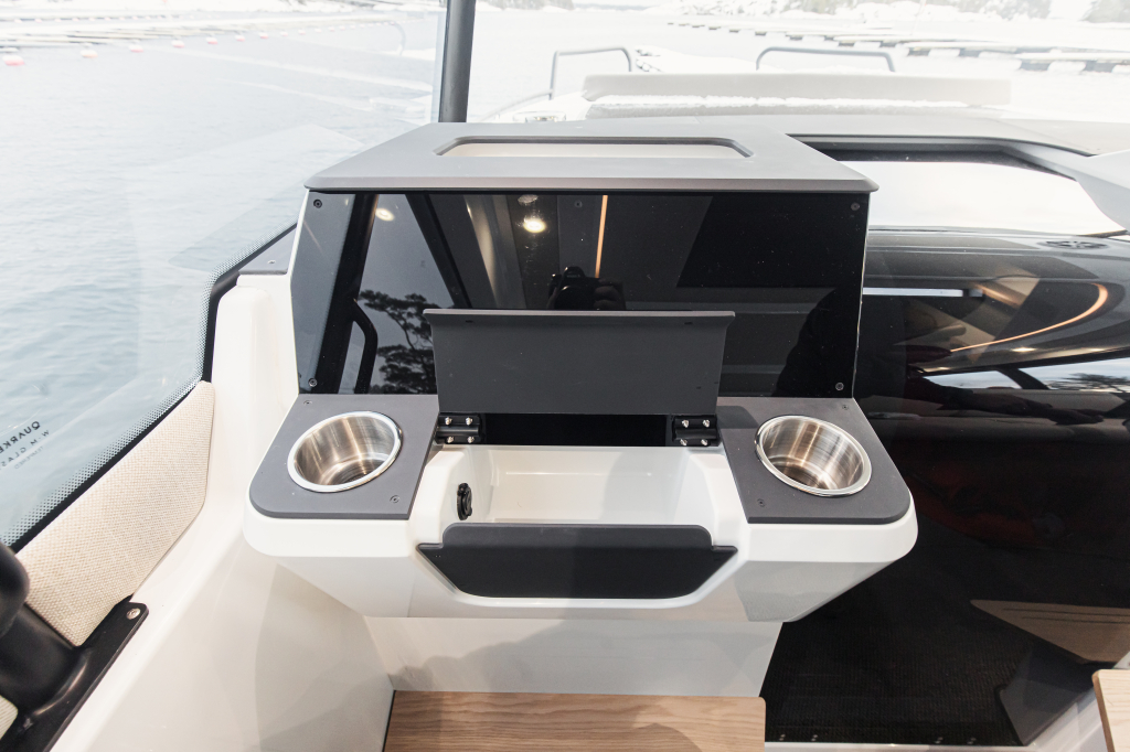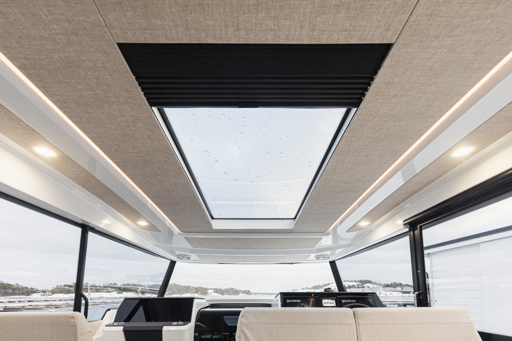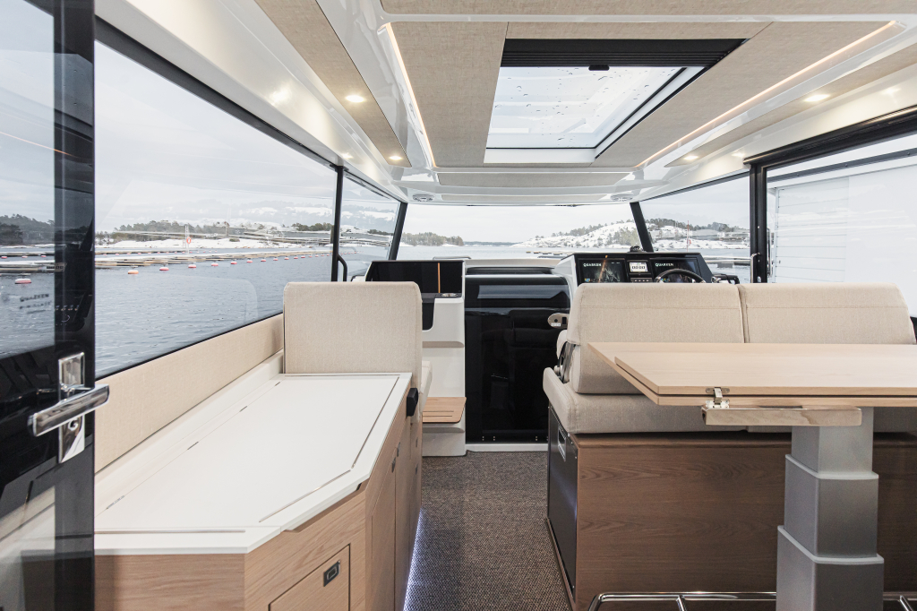 De ruime cabine is zeer toegankelijk en biedt een panoramisch uitzicht met uitstekend zicht. Het glazen dakraam zorgt voor een lichte en aangename sfeer. De Quarken 35 is in alles ruim en zeer praktisch in gedeeld.