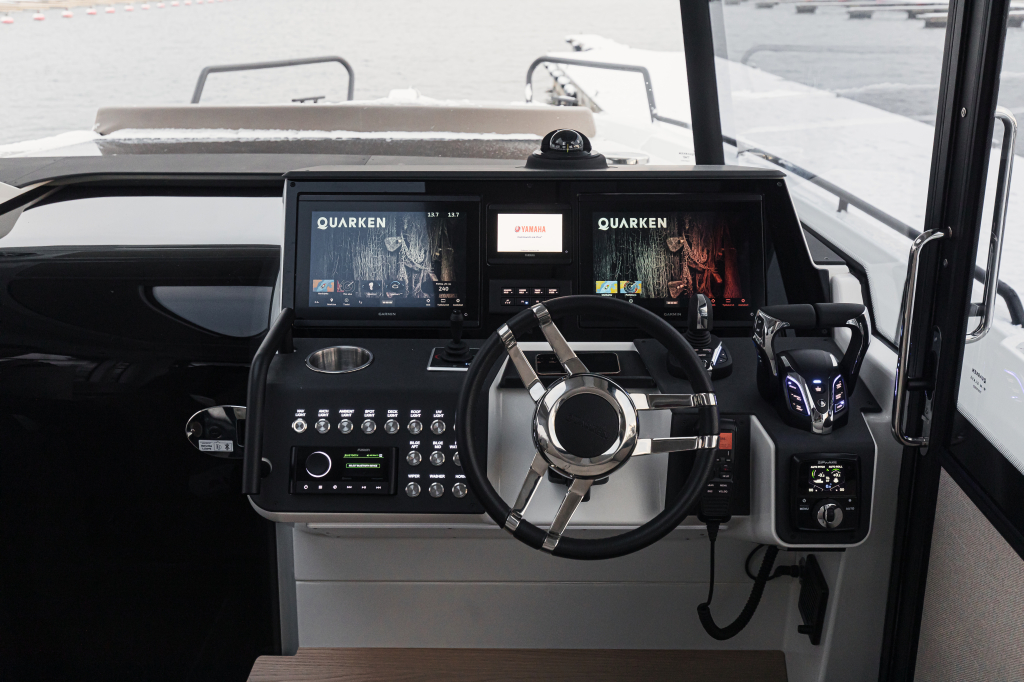 De Quarken 35 Cabin wordt aangedreven door twee Yamaha F300 buitenboordmotoren (optioneel 2x 350 pk) die aan al uw prestatiebehoeften voldoen. Deze combinatie zorgt voor dynamische en betrouwbare aandrijving. Ook wanneer de weersomstandigheden stormachtig zijn. De fraaie stuurpositie is ultramodern, op de bestuurder gericht en voorziet in optimaal zitcomfort.