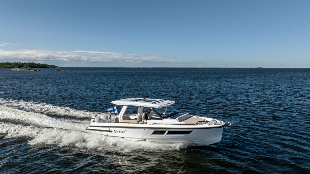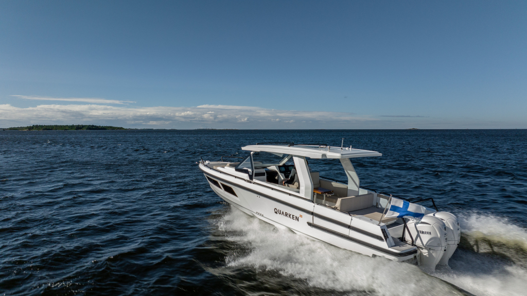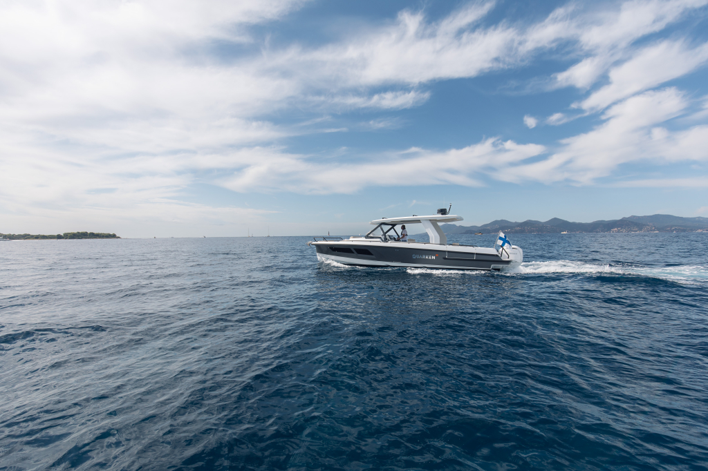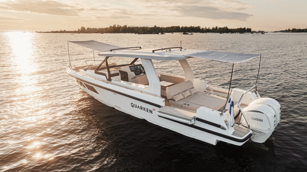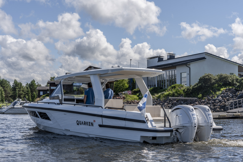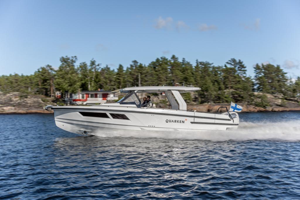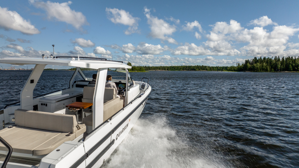 The 35 Sport Tourer shows how sophisticated Nordic design and solutions can be combined with superior performance for an unforgettable on-water experience. Cleverly designed seating arrangements offer plenty of relaxation space. The standard wet bar is well-equipped with storage space, a fridge and fresh water. The Quarken 35 Sport Tourer is designed, produced and assembled in Finland. The twin-step hull is manufactured by vacuum infusion technology that offers benefits as thickness control of the GRP and quality consistency in the production process. The outcome is a strong, nimble and lighter hull with lower fuel consumption.